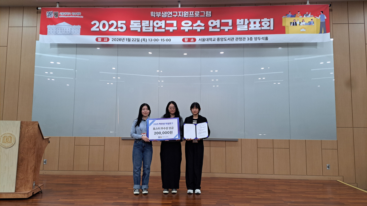 서울대학교 간호대학 Digital Health 연구실(지도교수 박초롱) 소속 학부생들이 서울대학교 학부대학이 주관하는 학생자율교육-학부생연구지원 프로그램의 일환인 2025년 학부생 독립연구에서 우수 포스터상을 수상하였다.