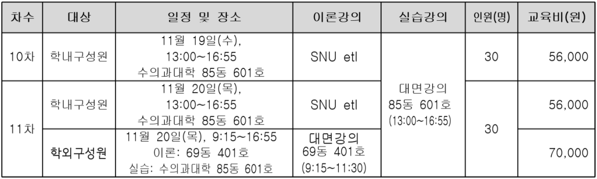 서울대학교 실험동물자원관리원에서 동물실험을 수행하는 연구자를 대상으로 아래와 같이 교육을 실시하고자 하오니, 많은 분들의 참여 바랍니다.