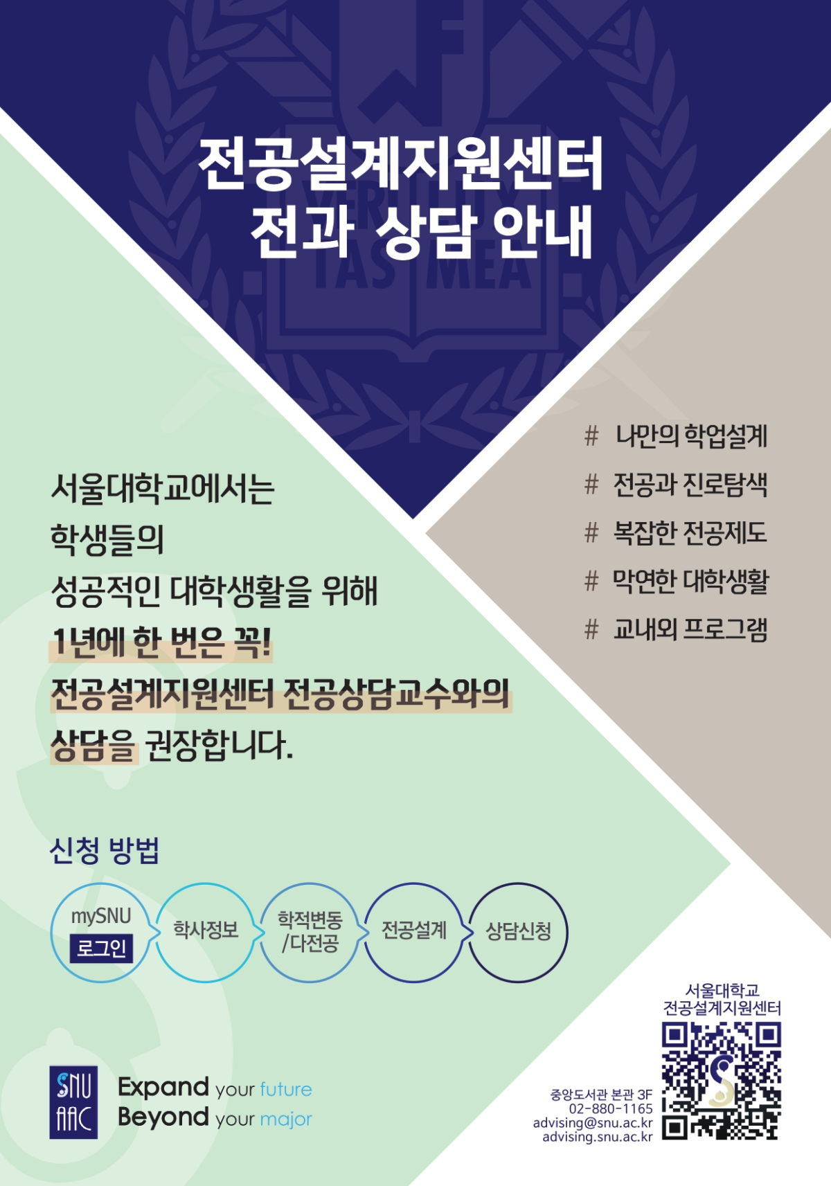 아울러, 교무처 전공설계지원센터에서는 Academic Advisor와의 1:1 상담을 통해 학생이 전공과 진로에 대한 맞춤형 학업계획을 수립할 수 있도록 지원하고 있으니, 학생들의 적극적인 활용 바랍니다.