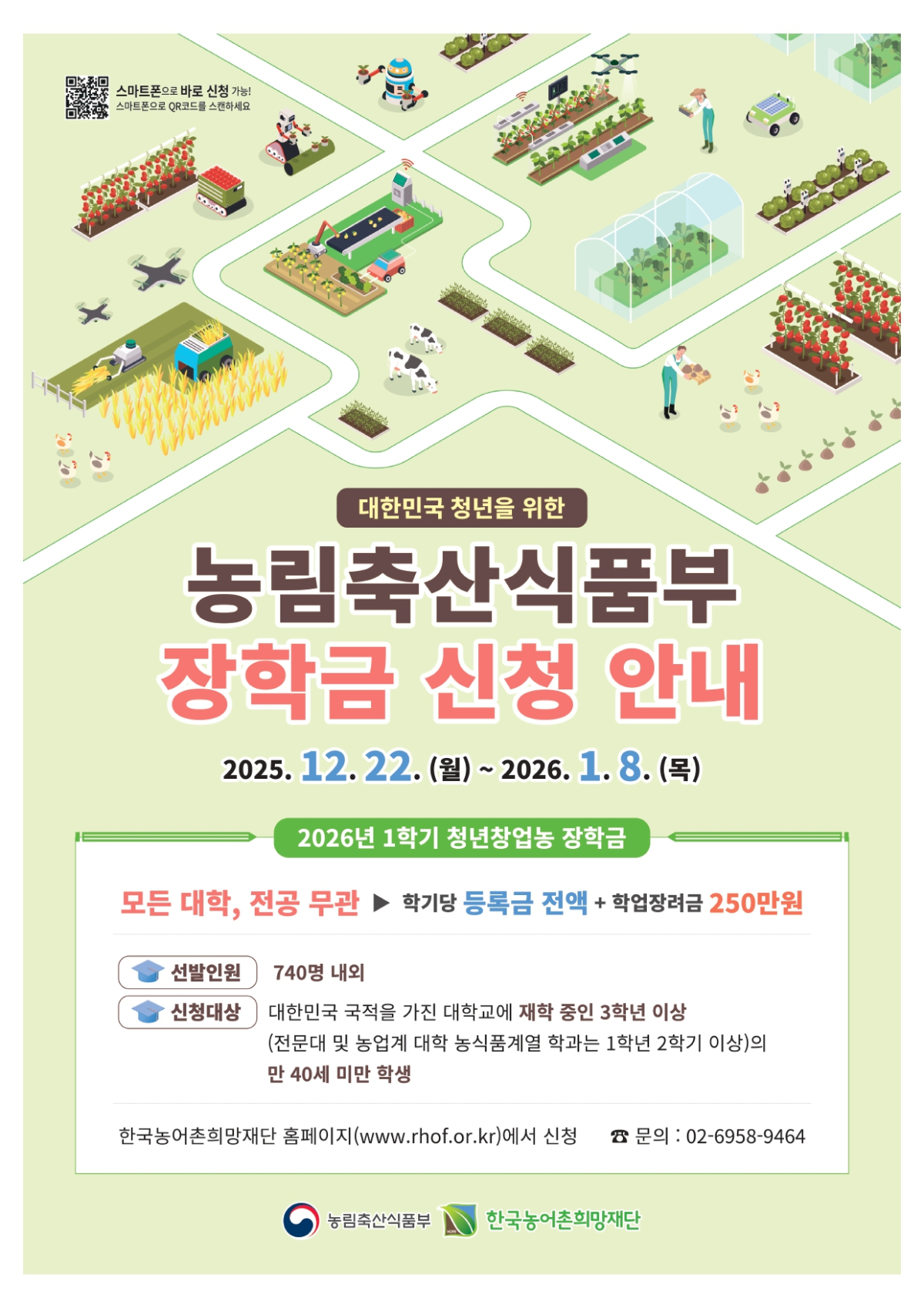 한국농어촌희망재단에서 아래와 같이 2026년 1학기 농림축산식품부 청년창업농장학금 장학생을 모집하니, 관심있는 구성원 여러분의 많은 지원 바랍니다.