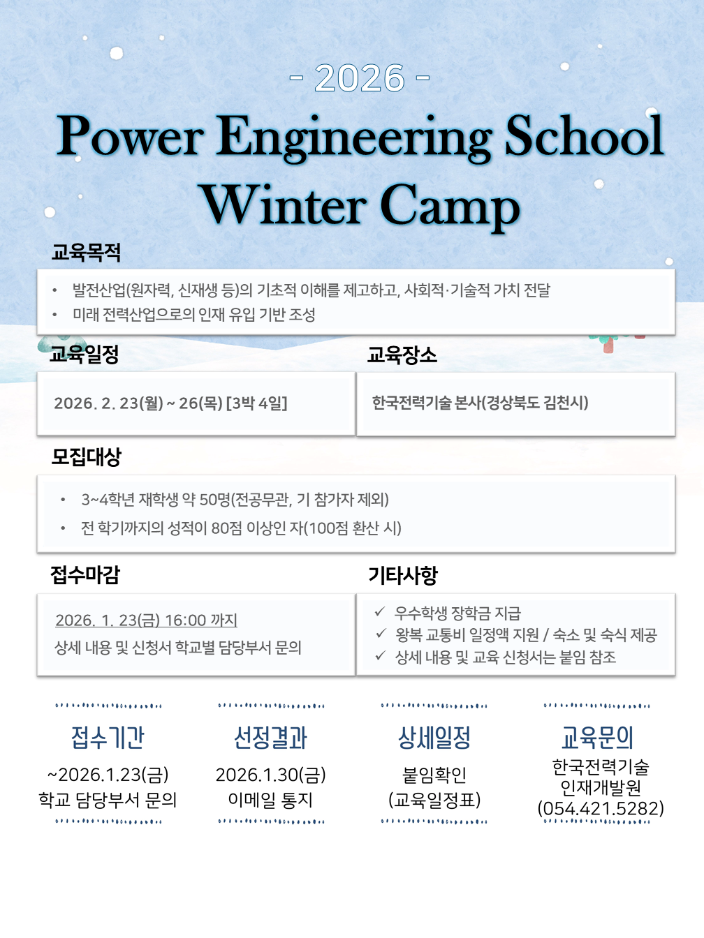 [학부] 2026년 Power Engineering School(PES) Winter Camp(33기) 참가 신청 안내(~1. 14.(수))